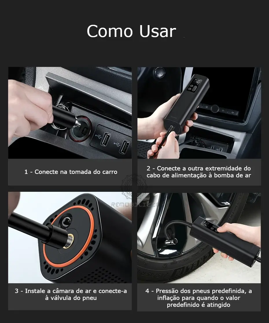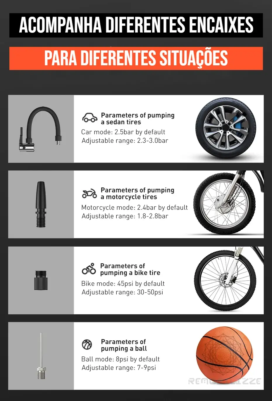 | Compatibilidade | Carros, motos, bicicletas, bolas esportivas, infláveis |